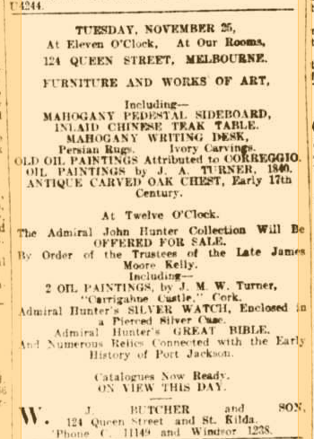 (Admiral John Hunter was the second Governor of New South Wales 1795-1800) and old Family Possessions of late Miss Alan Kelly, James Moore Kelly, and Commander John Moore, of His Majesty’s Fleet, 1757, George 111., including PAINTINGS by Great Old Masters, etc.